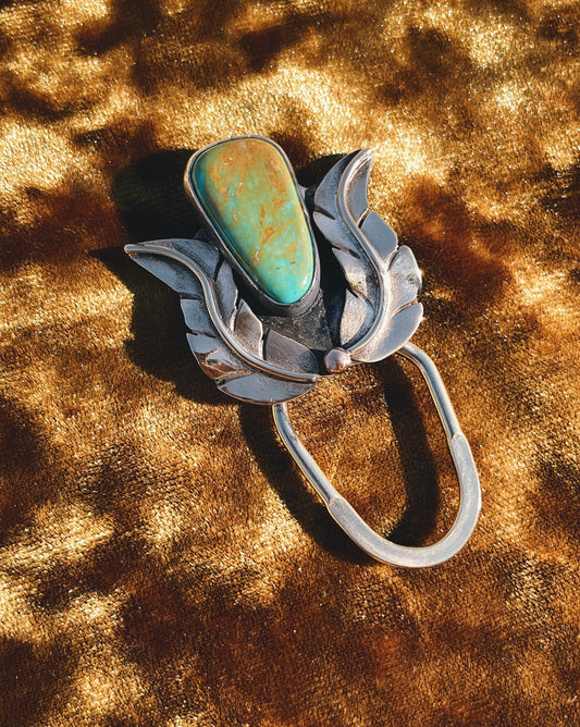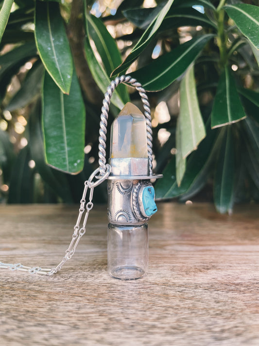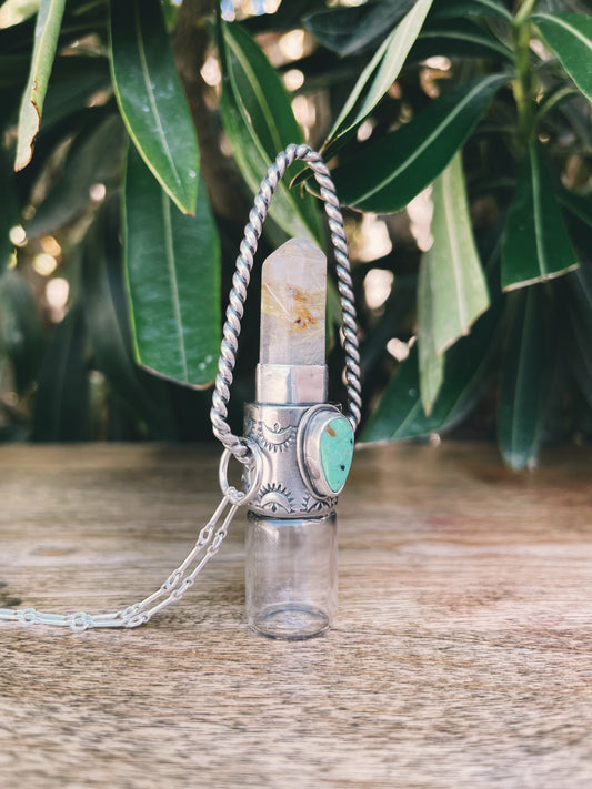 Sterling Silver Twisted Geometric - Gold Rutilated Quartz + Royston Turquoise Rollerball Necklace