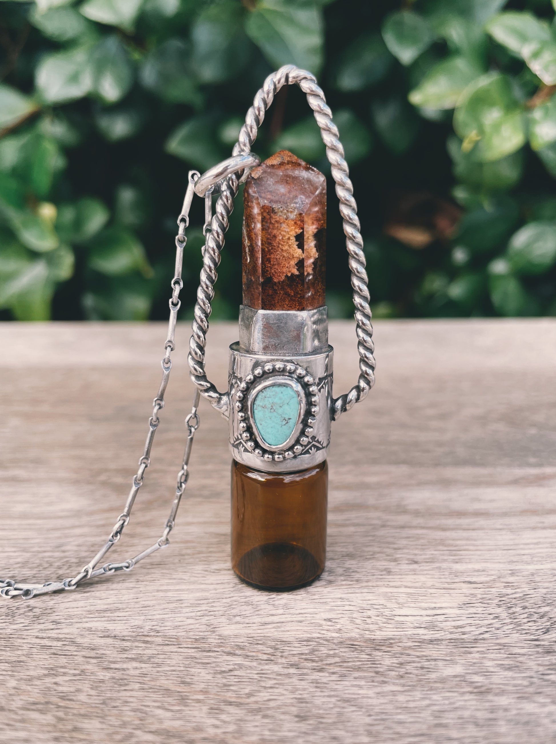Original Roadkill Gems design! This handmade sterling silver pendant features Amphibole Quartz, with a Geometric bail. Keep your favorite essential oils and perfumes close to you.
