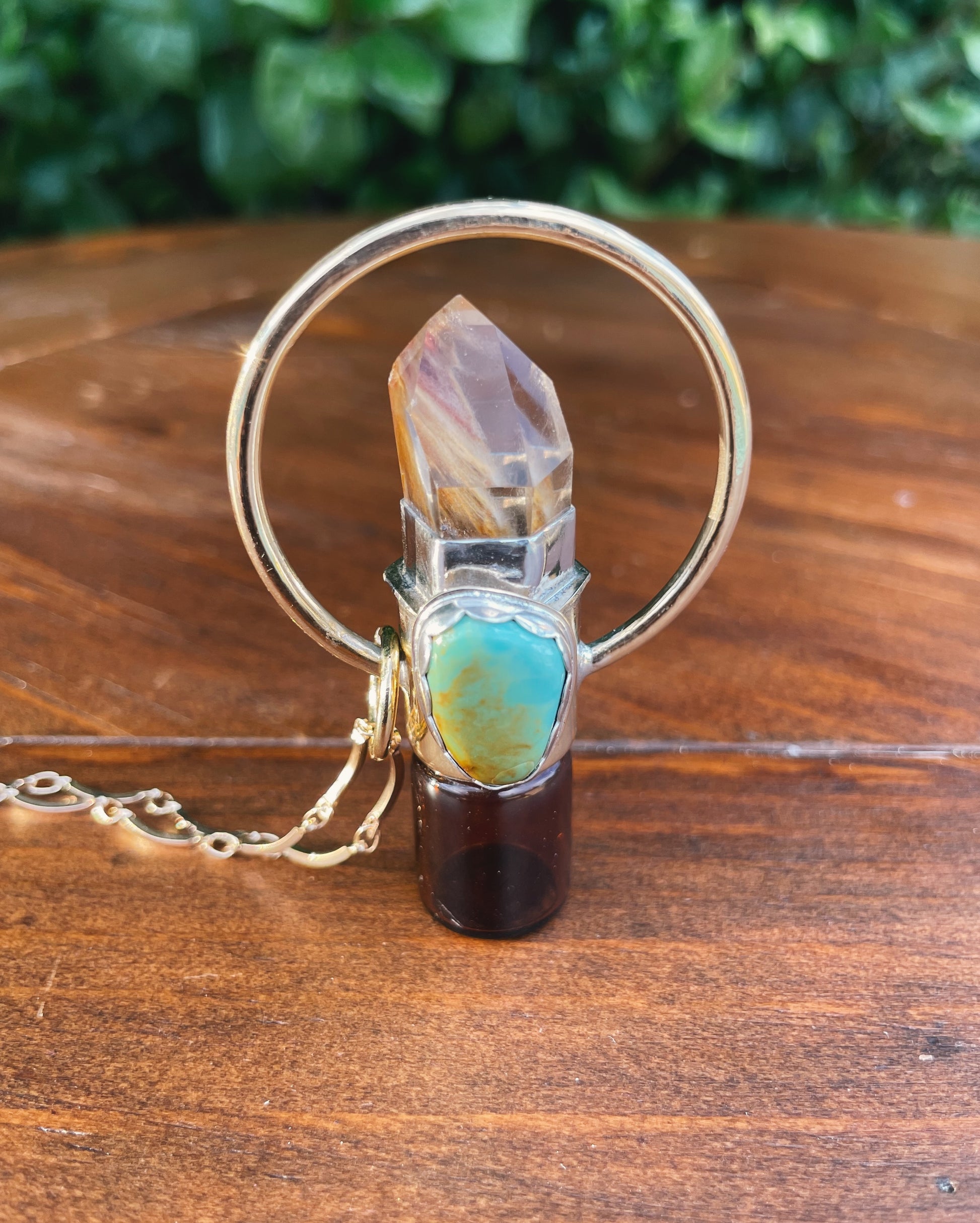 Handmade Brass & Sterling Silver Rollerball necklace  featuring Amphibole Quartz point and Sonoran Turquoise cabbed in house by yours truly. Keep your favorite essential oils and perfumes close to you with this one-of-a-kind necklace.