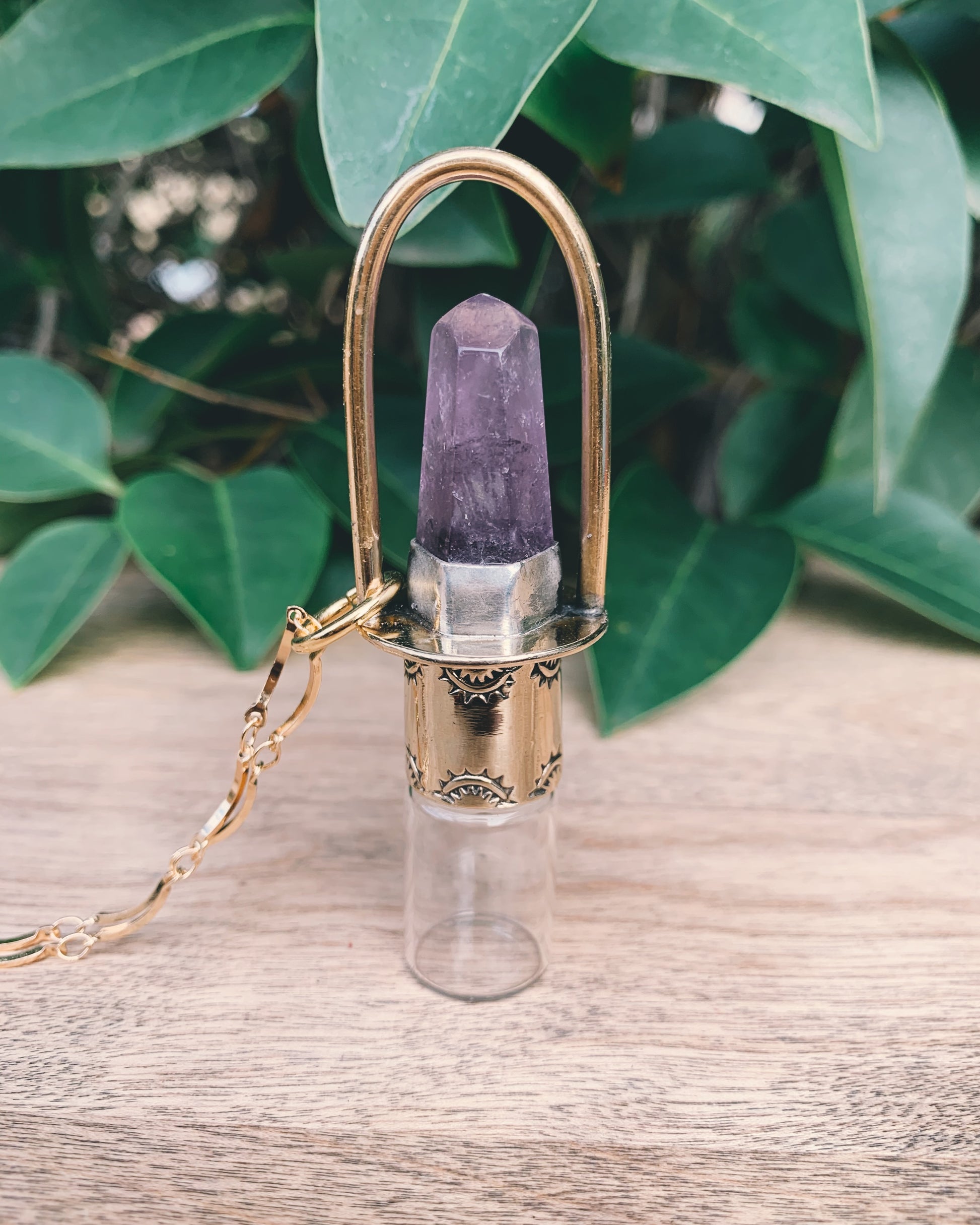 Original Roadkill Gems design! This handmade pendant features Amethyst and Brass, with a Classic bail and Sun stamping. Keep your favorite essential oils and perfumes close to you.