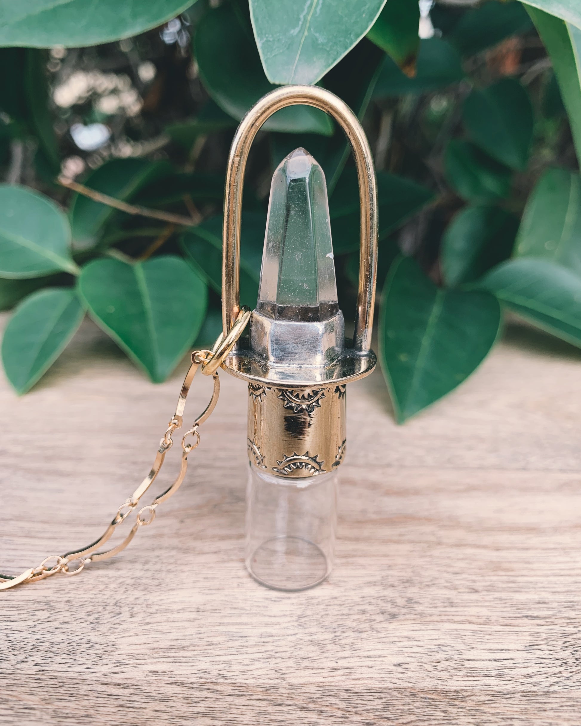 Original Roadkill Gems design! This Brass handmade pendant features Clear Quartz, with a Classic bail and Sun stamping. Keep your favorite essential oils and perfumes close to you.