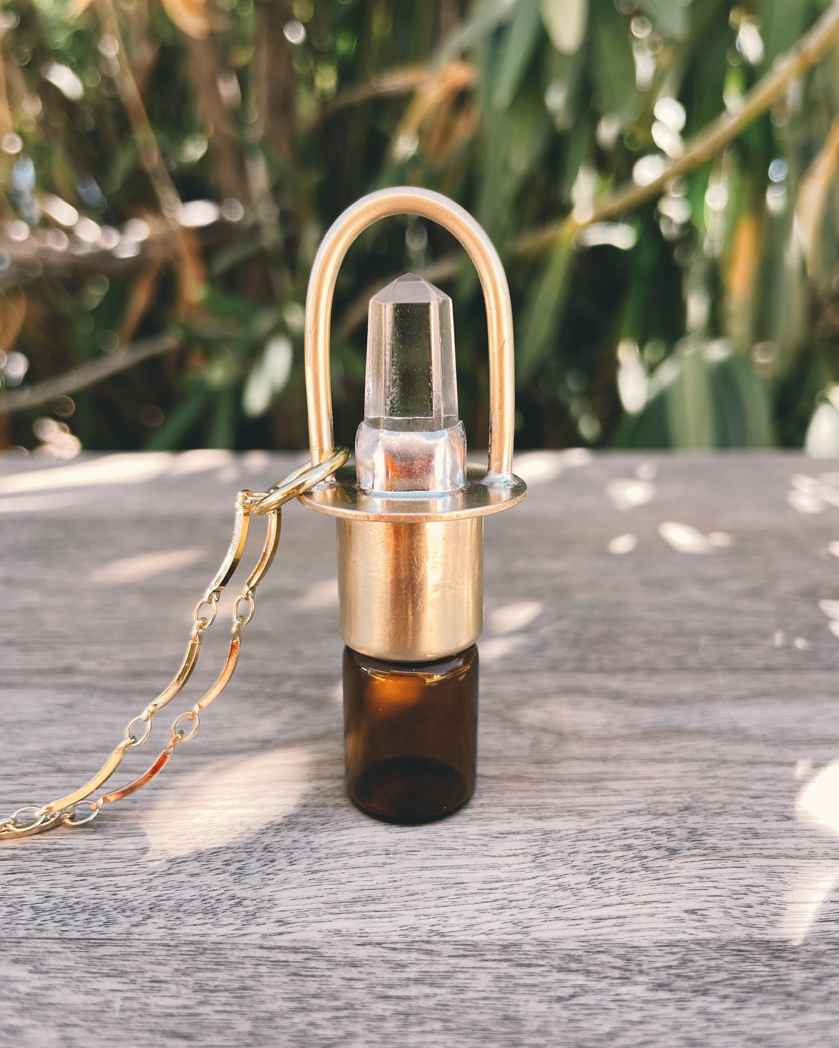 Original Roadkill Gems design! This handmade pendant features Clear Quartz and Brass, with a Classic bail. Keep your favorite essential oils, perfume or even lip gloss close to you.