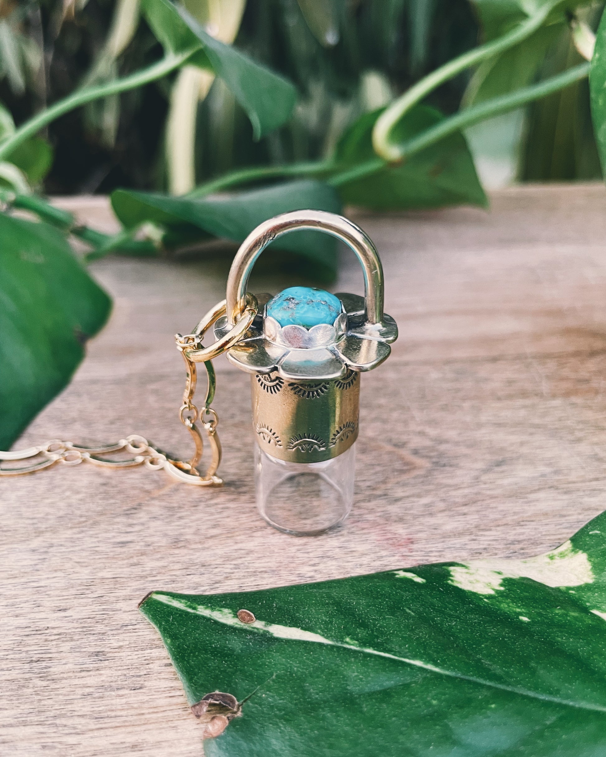 Original Roadkill Gems design! Summer is here and it's time to bring back the RKG Daisy. This Brass handmade/casted pendant features Kingman Turquoise, with a mini bail and custom flower petals. Keep your favorite essential oils and perfumes close to you.