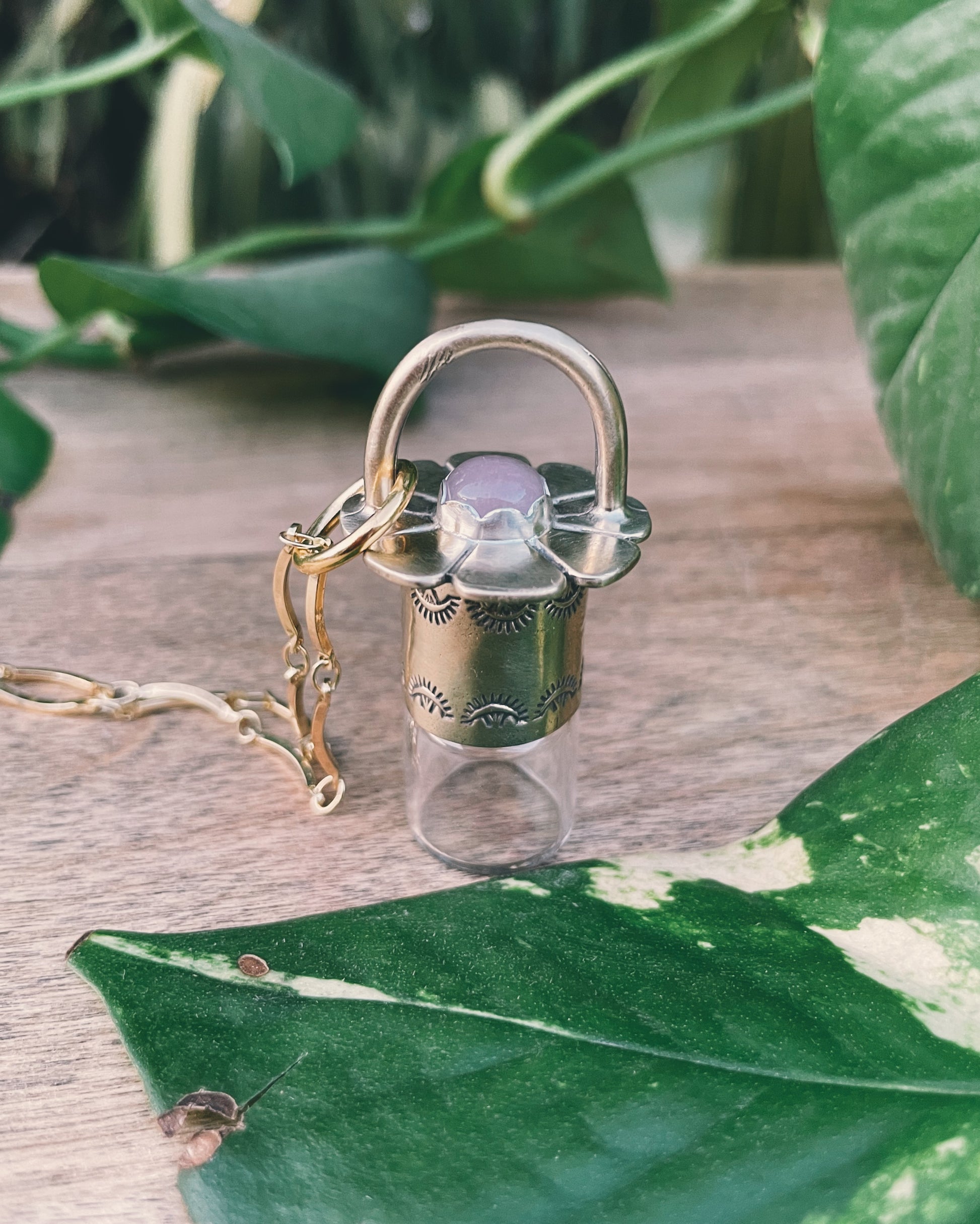 Original Roadkill Gems design! Summer is here and it's time to bring back the RKG Daisy. This brass handmade/casted pendant features kunzite, with a mini bail and custom flower petals. Keep your favorite essential oils and perfumes close to you.
