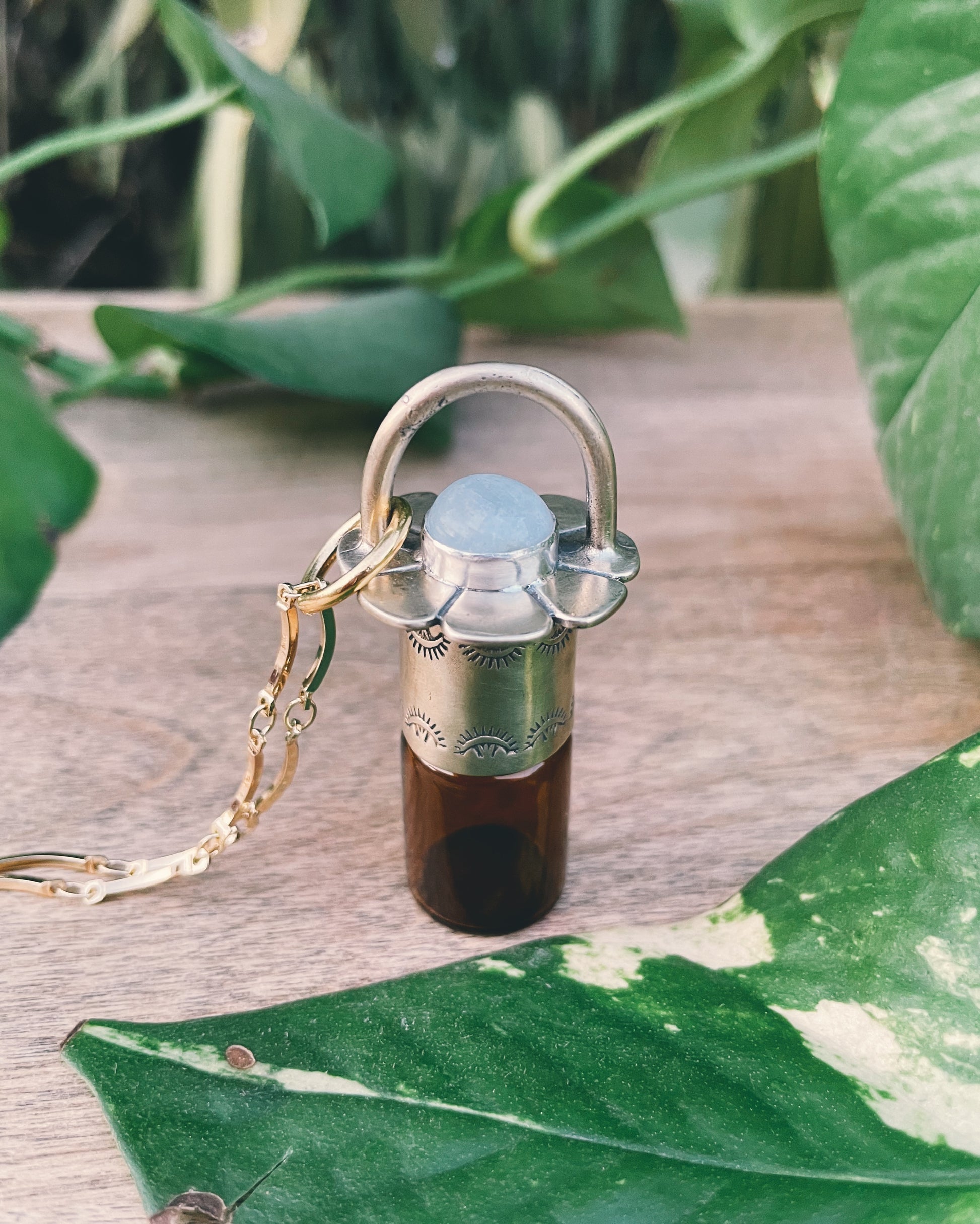 Original Roadkill Gems design! Summer is here and it's time to bring back the RKG Daisy. This Brass handmade/casted pendant features Rainbow Moonstone, with a mini bail and custom flower petals. Keep your favorite essential oils and perfumes close to you.