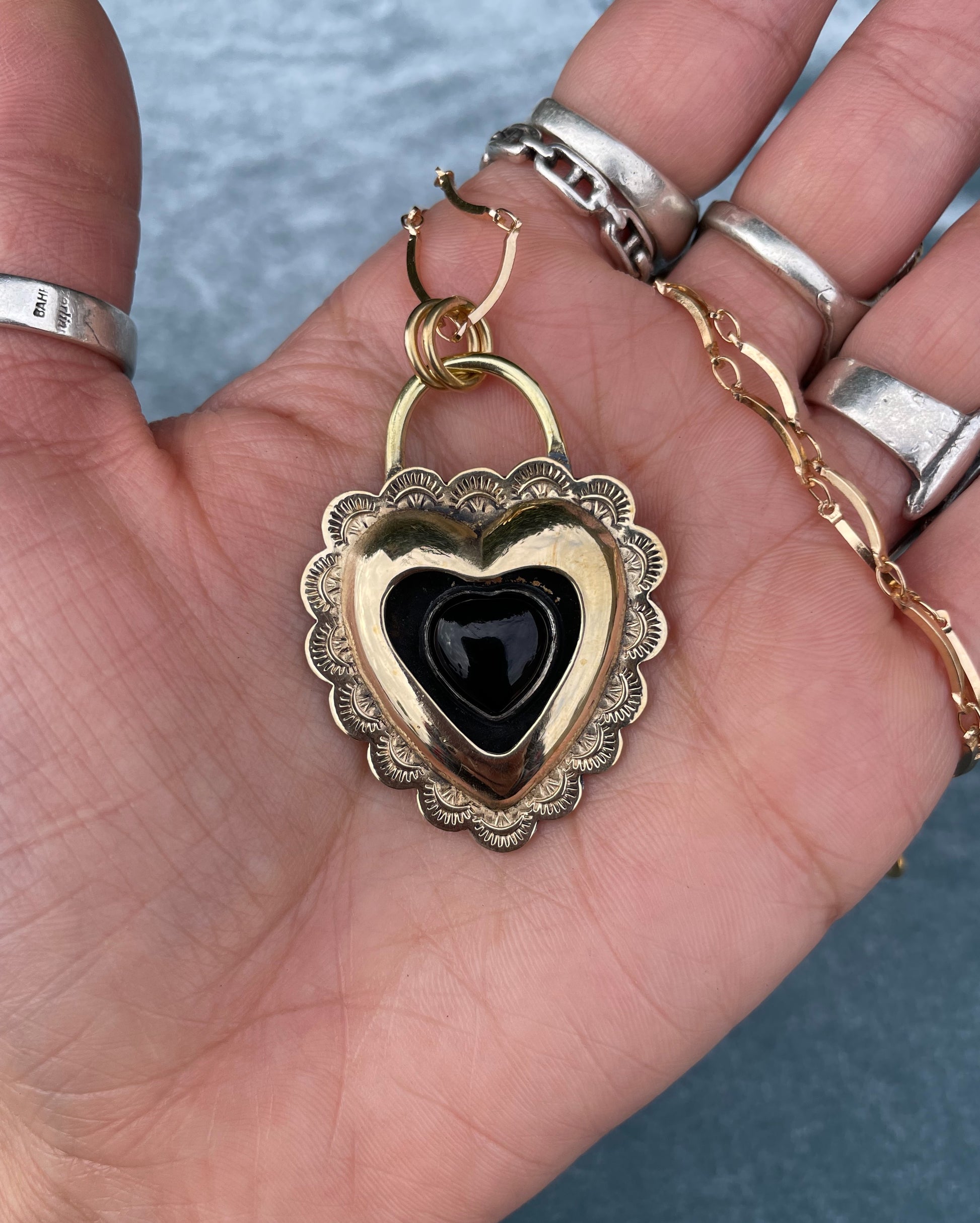 Shadowbox Heart pendant shaped by pressure, time, and hand. Formed from red brass using a hydraulic press and antique die. After pressing, the piece is hand fabricated. At the center sits Black Onyx bezeled in fine Silver.
