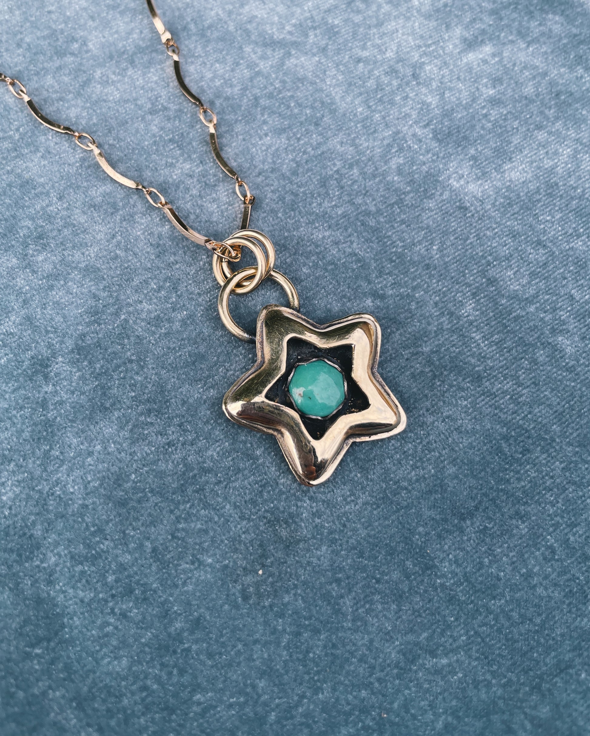 Shadowbox Star pendant shaped by pressure, time, and hand. Formed from red brass using a hydraulic press and antique die. After pressing, the piece is hand fabricated. At the center sits Fox Turquoise bezeled in fine Silver.