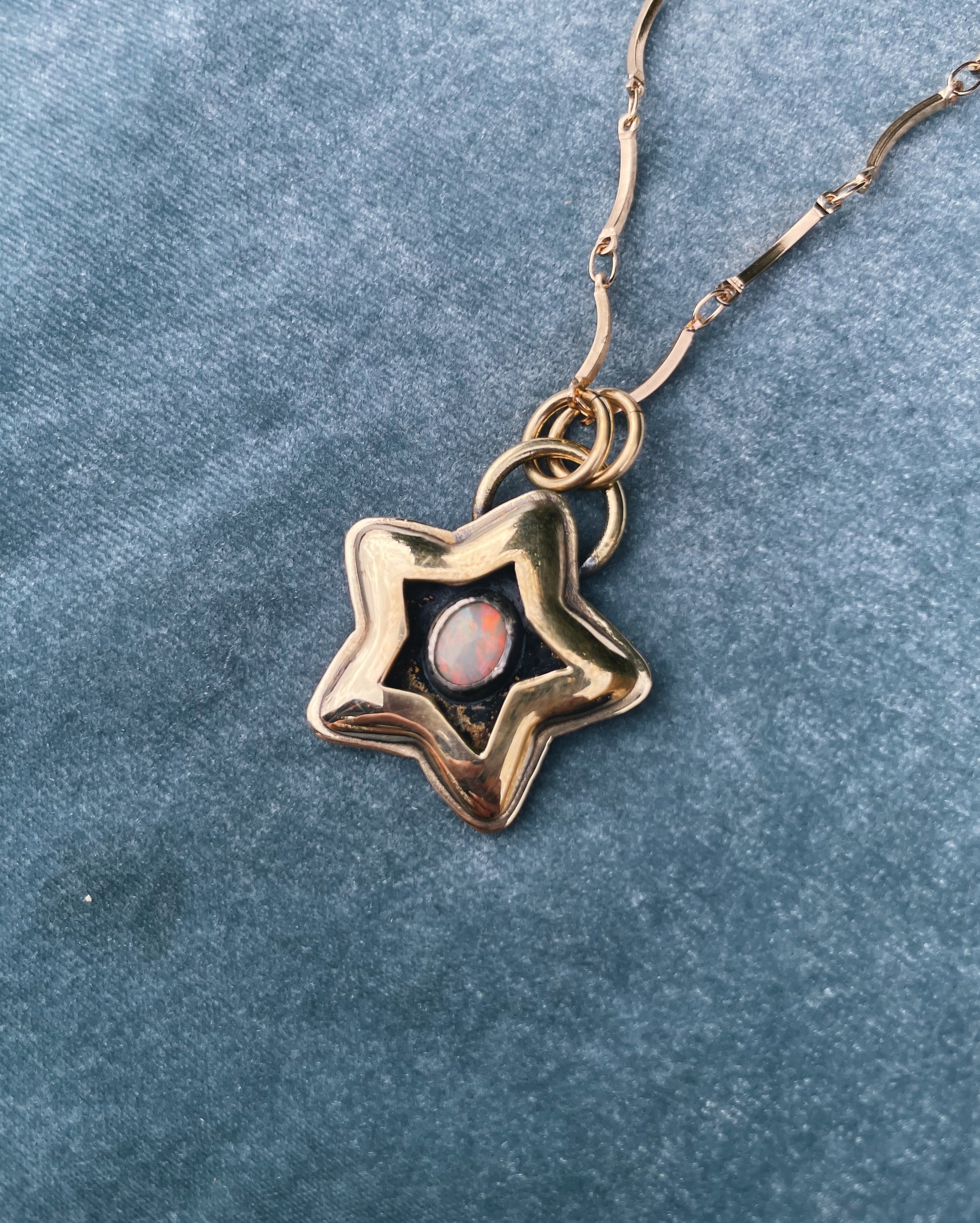Shadowbox Star pendant shaped by pressure, time, and hand. Formed from red brass using a hydraulic press and antique die. After pressing, the piece is hand fabricated. At the center sits a luminous Australian Opal bezeled in fine Silver.