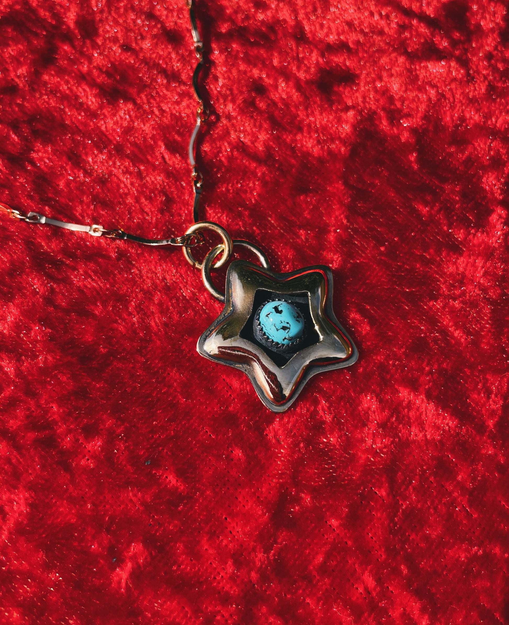Shadowbox Star pendant shaped by pressure, time, and hand. Formed from red brass using a hydraulic press and antique die. After pressing, the piece is hand fabricated. At the center sits Sleeping Beauty Turquoise bezeled in fine Silver.
