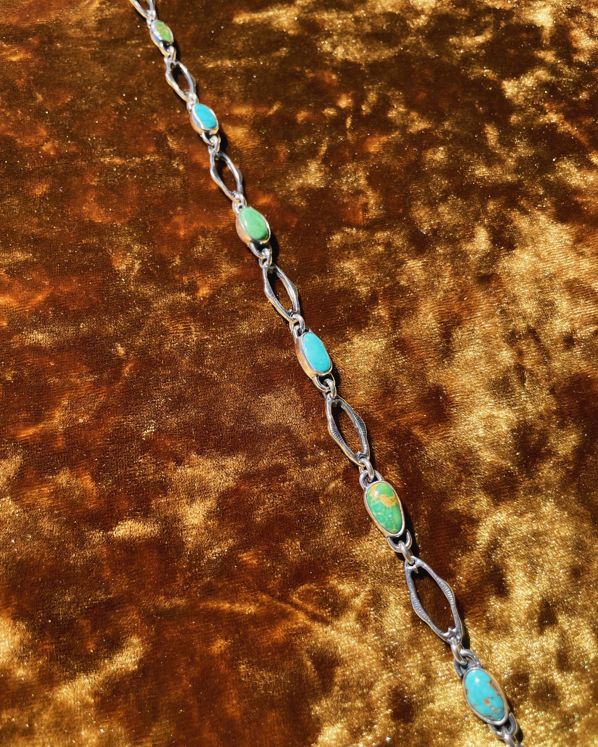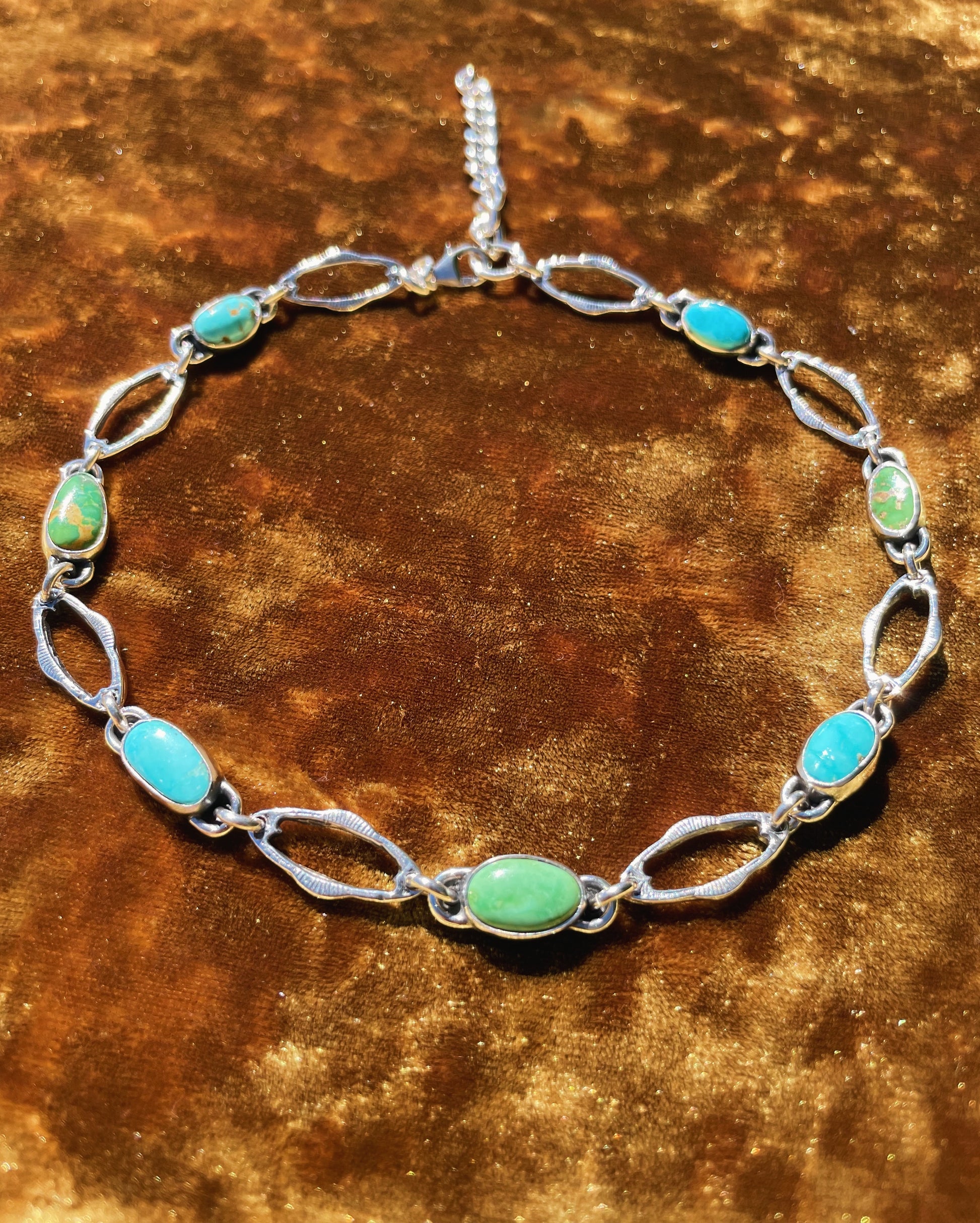Handmade sterling silver choker necklace, featuring Sonoran Turquoise. Each link is crafted from an antique die, using the sand casting technique that adds a unique charm to every piece.