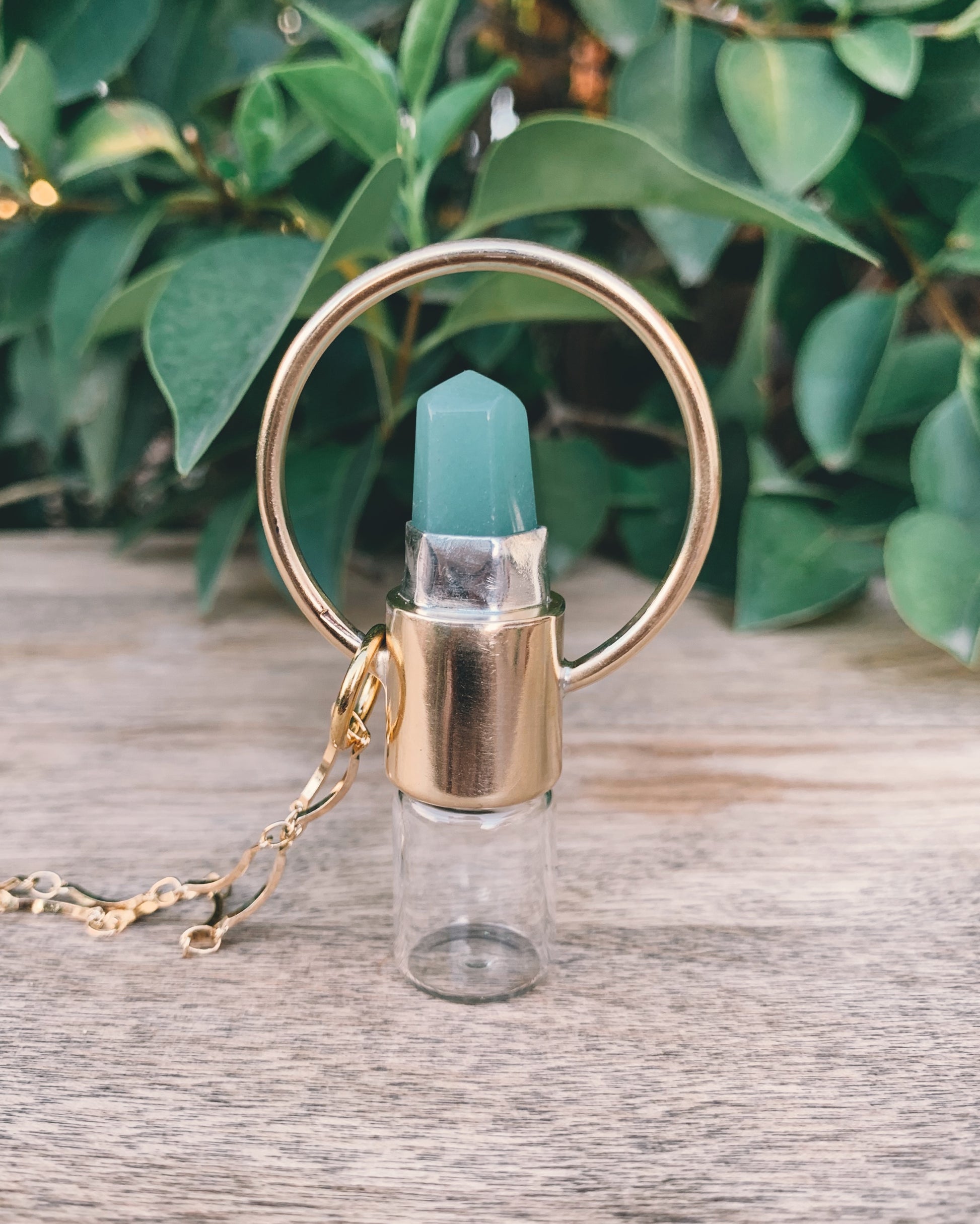 Original Roadkill Gems design! This handmade pendant features Green Aventurine and Brass, with a Horizon bail. Keep your favorite essential oils, perfume or even lip gloss close to you.
