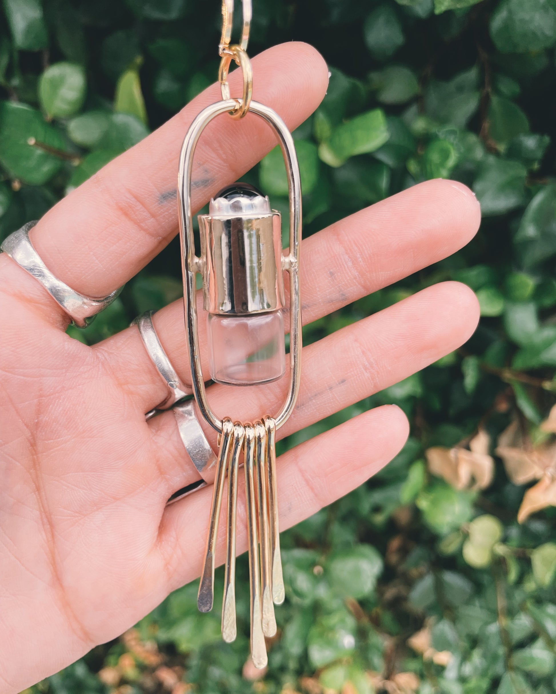 Handmade from Brass and sterling silver, this pendant features Black Onyx. Its minimalist lucid bail adds a touch of modernity to the design. Keep your beloved essential oils and perfumes within easy reach.