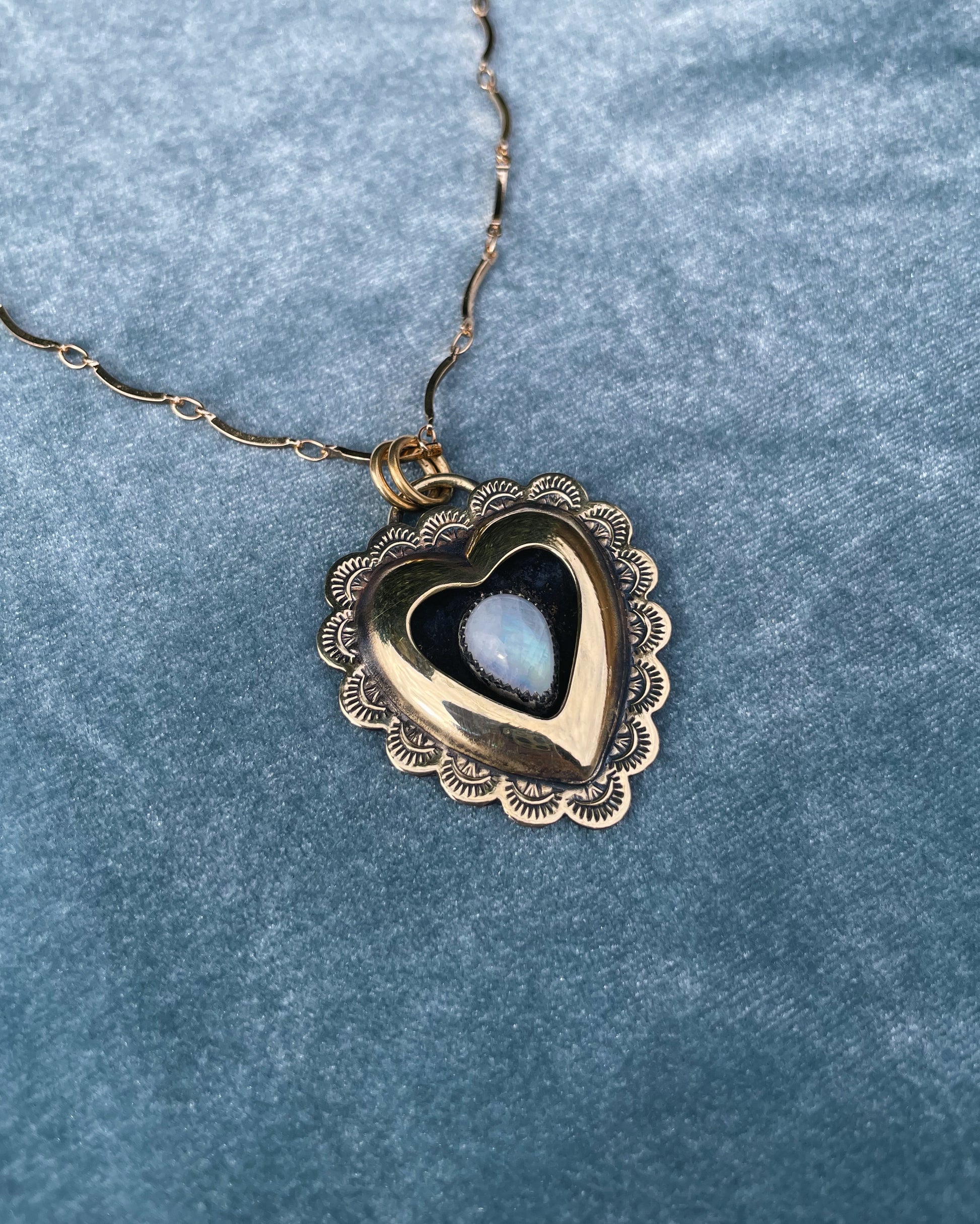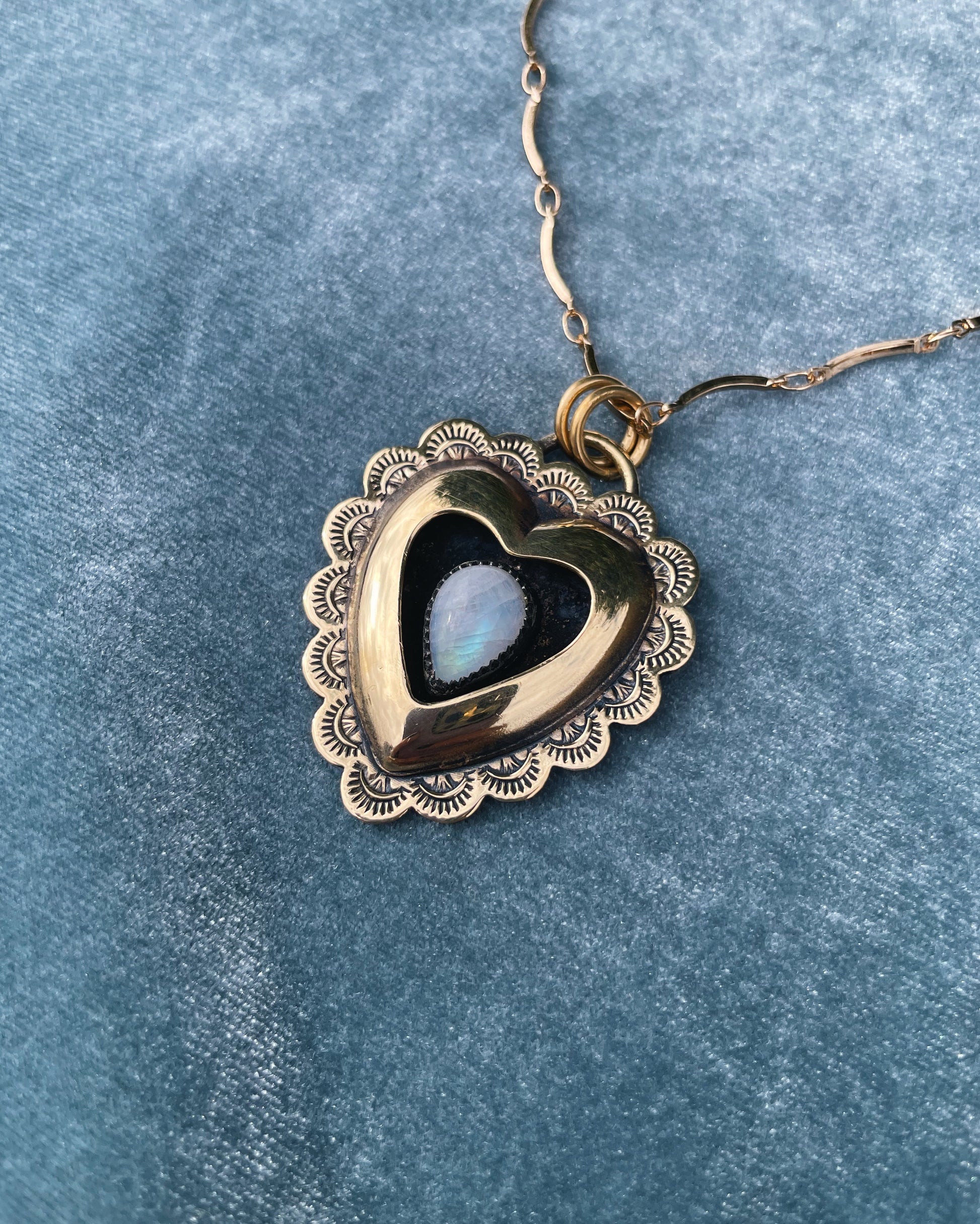 Shadowbox Heart pendant shaped by pressure, time, and hand. Formed from red brass using a hydraulic press and antique die. After pressing, the piece is hand fabricated. At the center sits Rainbow Moonstone bezeled in fine Silver.