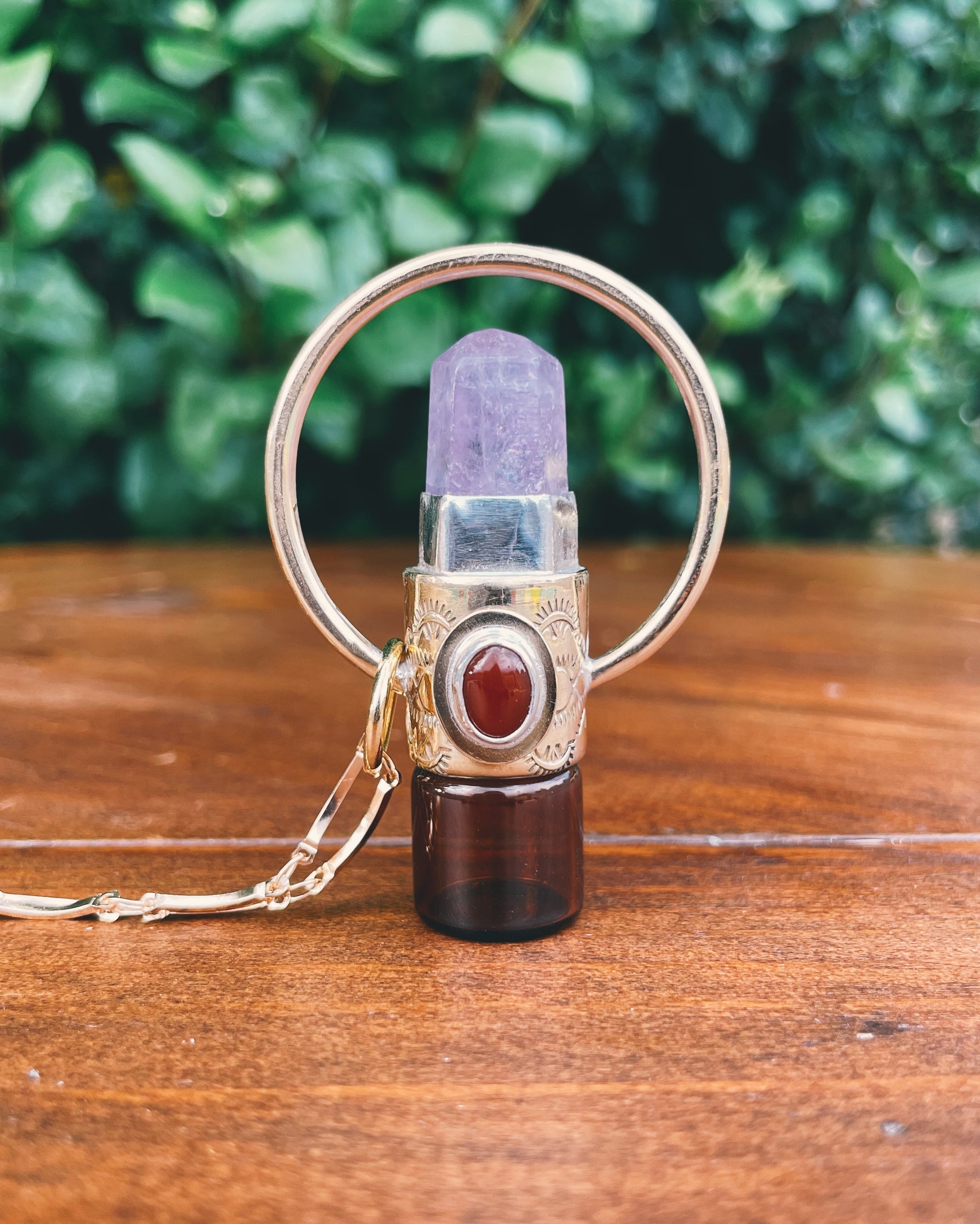 Handmade Brass & Sterling Silver Rollerball necklace featuring Amethyst and Carnelian. Keep your favorite essential oils and perfumes close to you with this one-of-a-kind necklace.