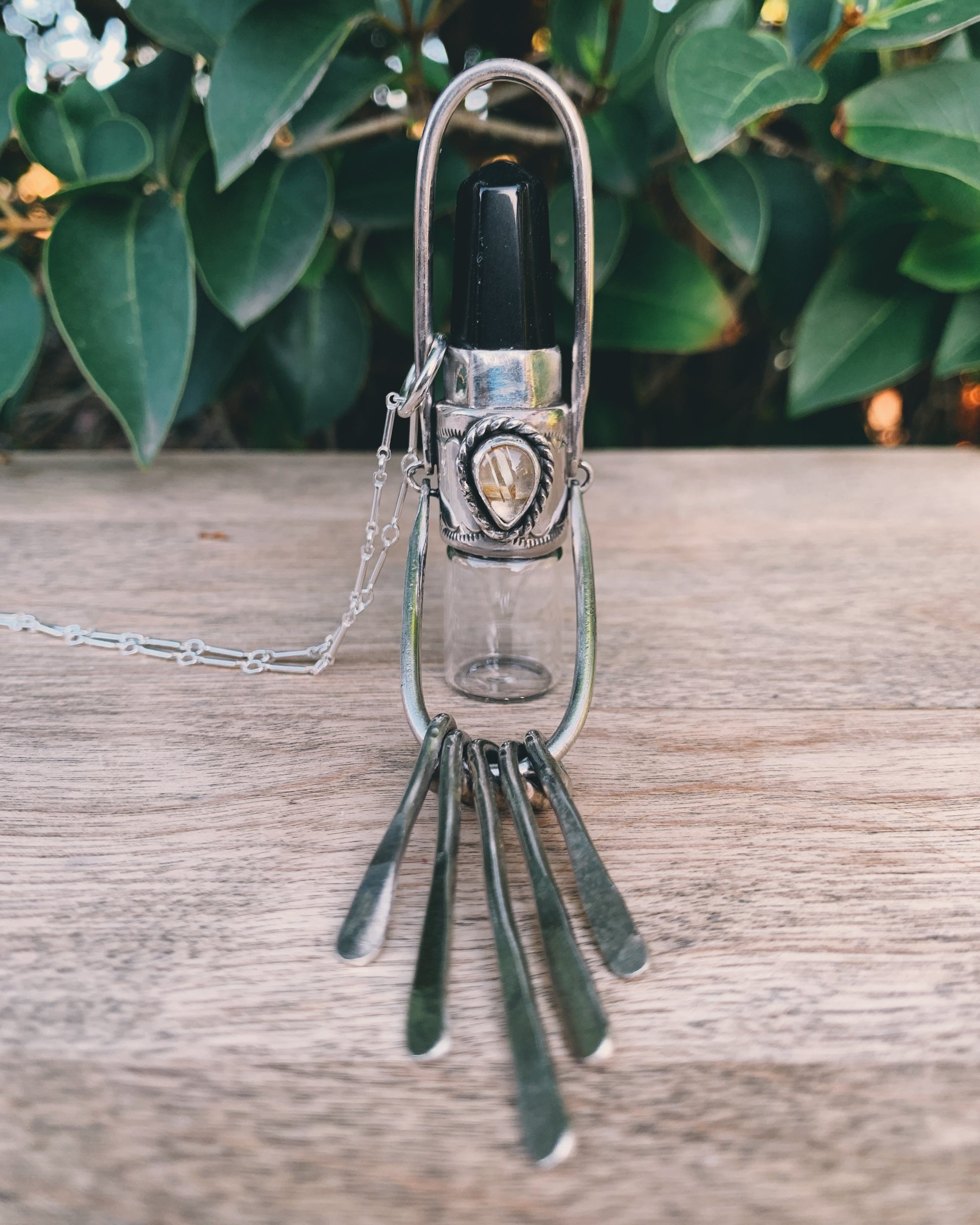 Original Roadkill Gems design! This Sterling Silver handmade pendant features a double stone. Obsidian point, Golden Rutilated Quartz cab, with a Classic bail and fringe tassel. Keep your favorite essential oils and perfumes close to you.