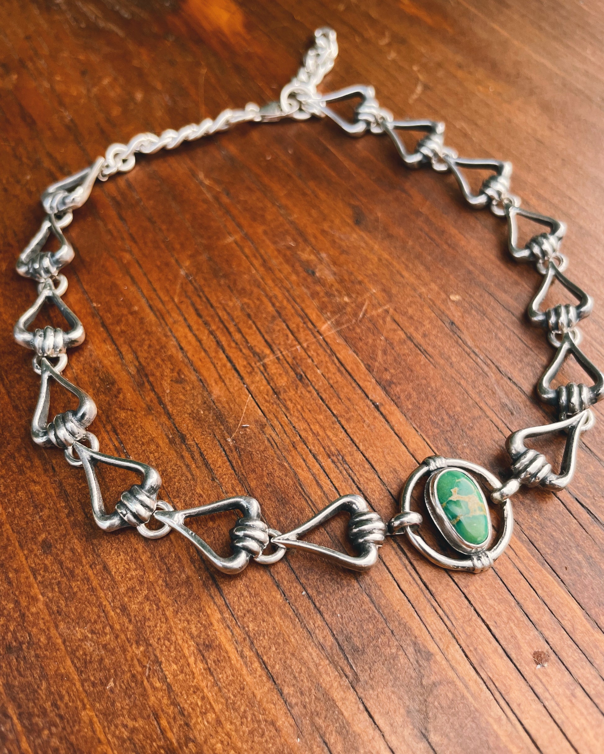 Handmade sterling silver choker necklace, featuring Sonoran Turquoise. Each link is crafted from an antique die, using the sand casting technique that adds a unique charm to every piece.