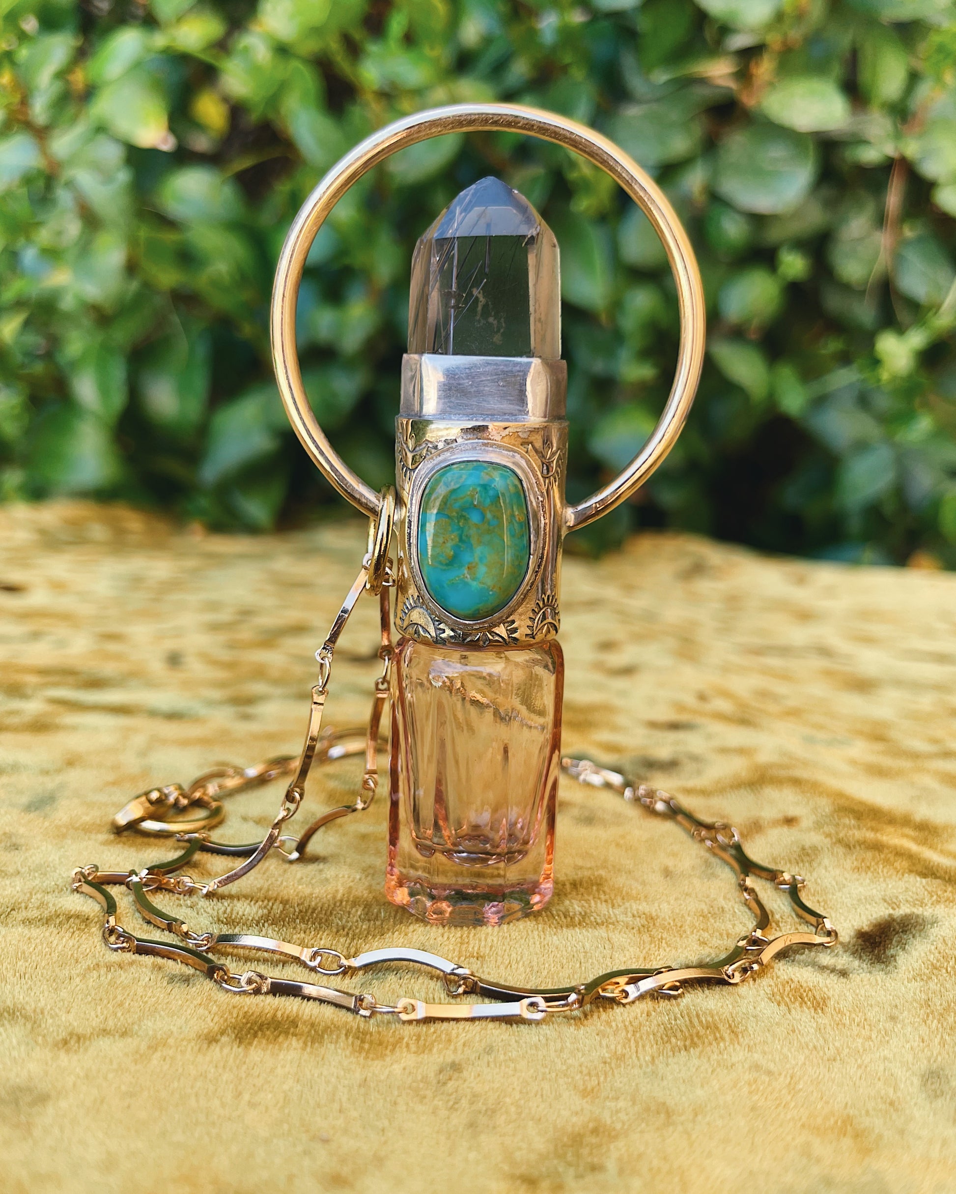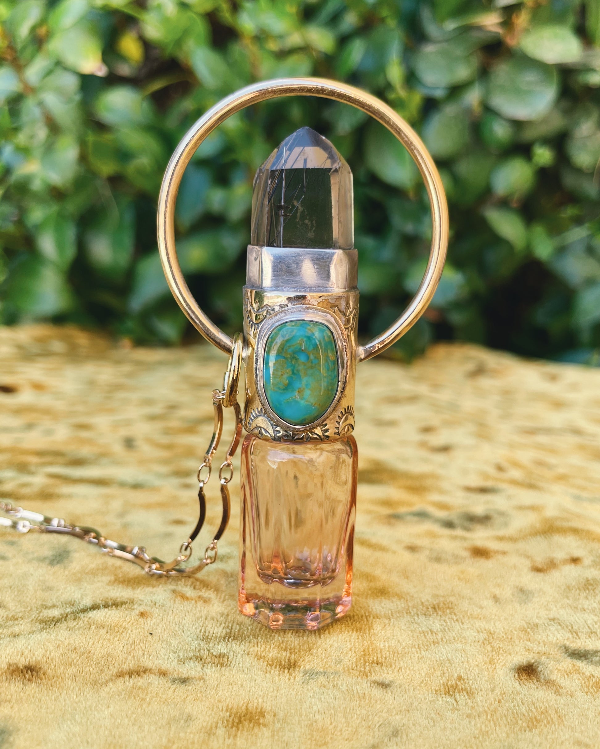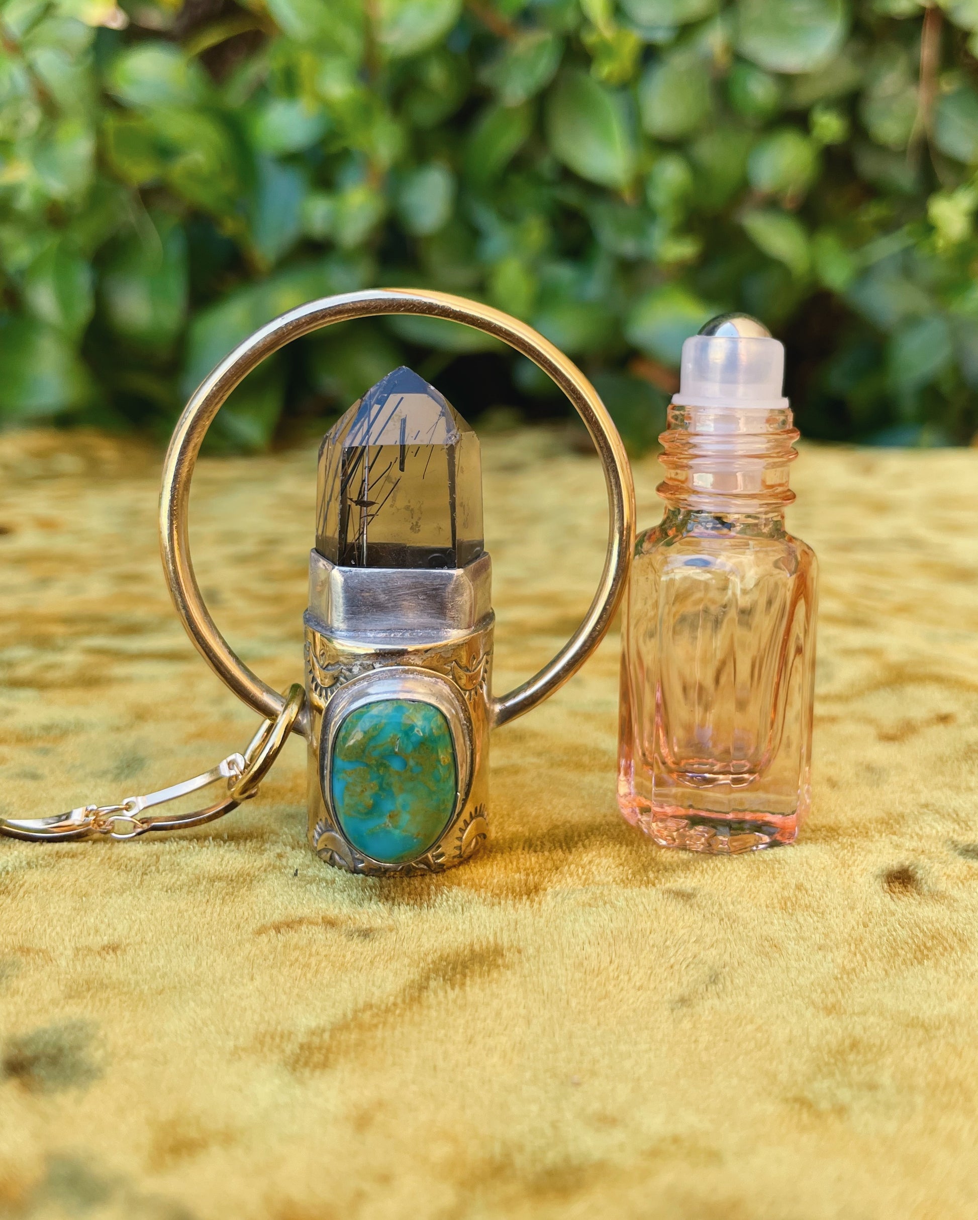 Handmade Brass & Sterling Silver Rollerball necklace featuring Black Rutilated Quartz point and Sonoran Turquoise cabbed in house by yours truly. Keep your favorite essential oils and perfumes close to you with this one-of-a-kind necklace.